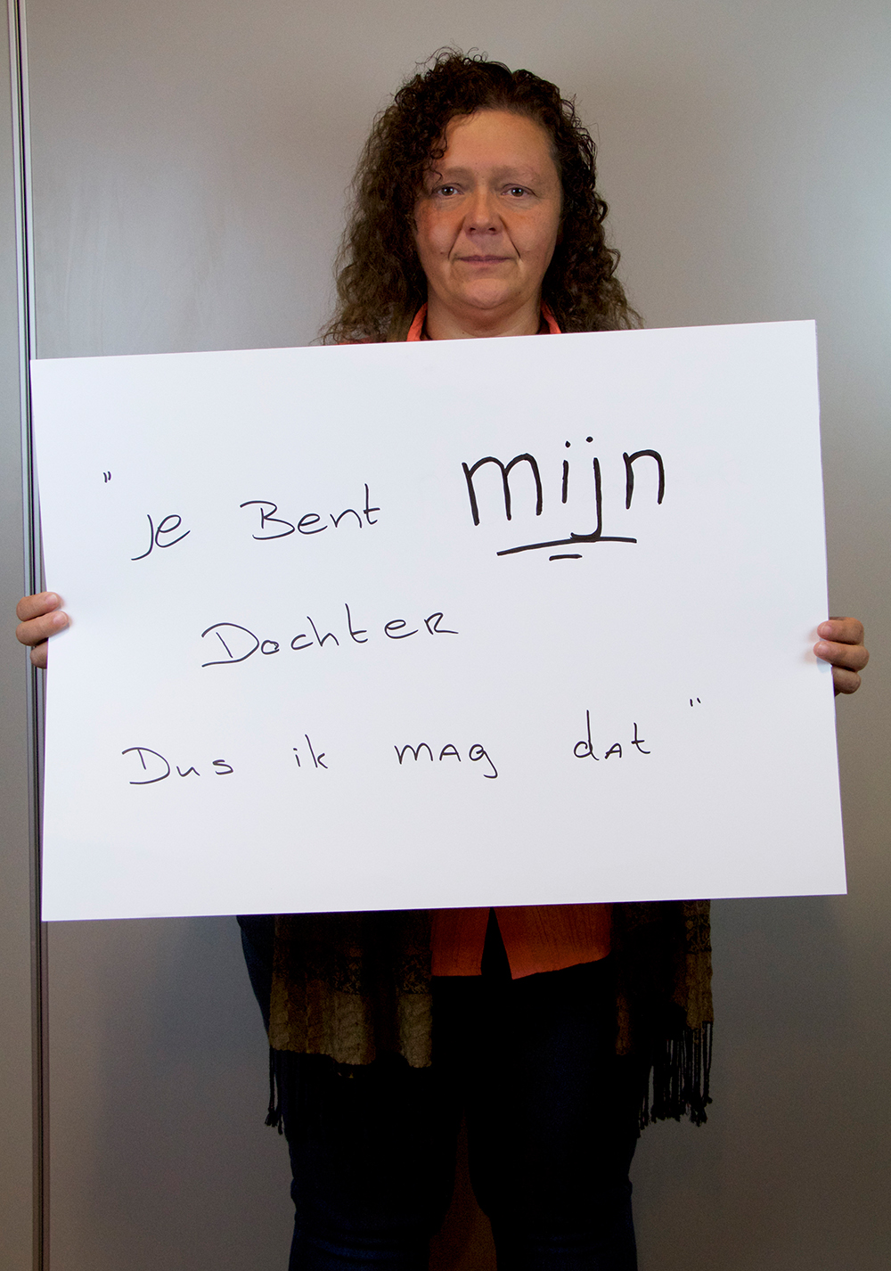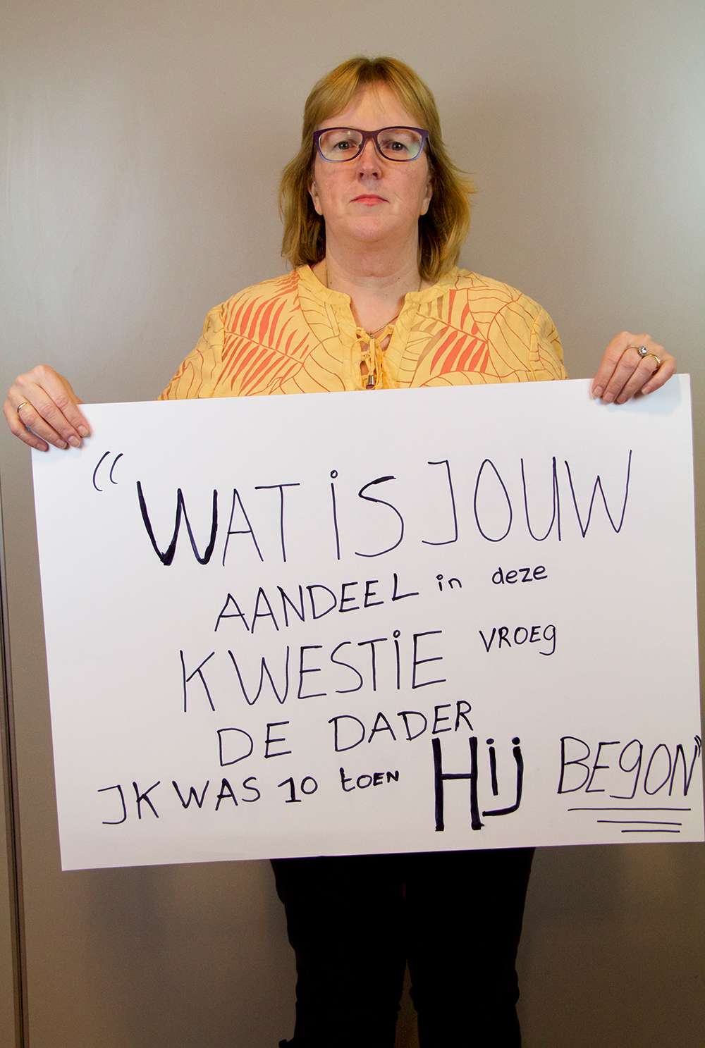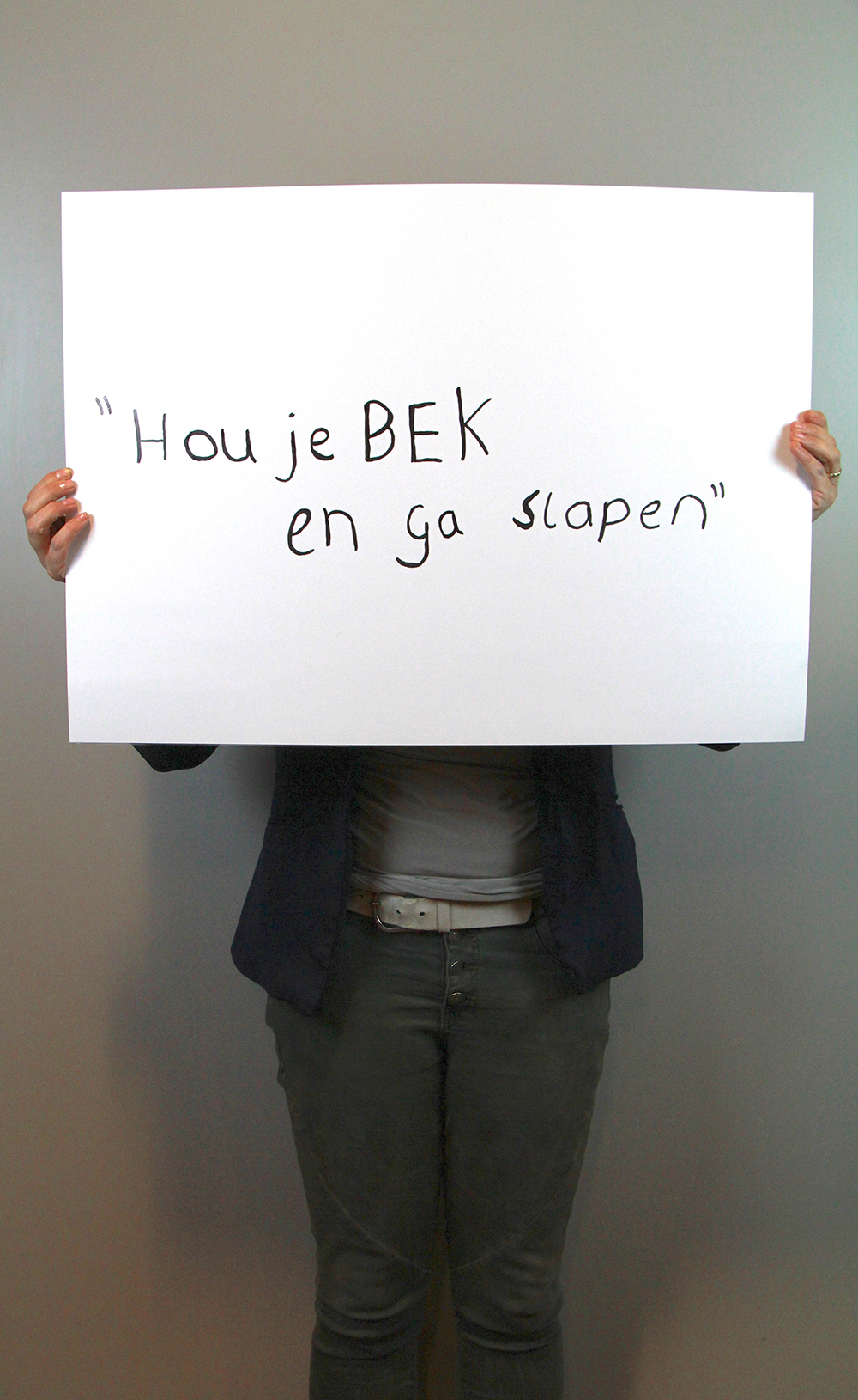 Na een lekkere lunch in het inpandige cafe gingen de deelnemers aan de slag. Uitspraken werden onderzocht en opgeschreven. Ondertussen begon Jeanette Koenen met het op de foto zetten van de eerste dappere deelnemers. Voor sommige was het makkelijk, voor een aantal zeer heftig. Er werd gelachen en gehuild. Rosemary Lengton zong een lied wat ze speciaal gemaakt had voor de week tegen kindermishandeling. Ondertussen was er een uitgebreide borrel, waar goed gebruik van gemaakt werd. Als afsluiting droeg Monique nog gedichten voor, waarna we na een dankwoord vermoeid maar voldaan afscheid van elkaar namen.
